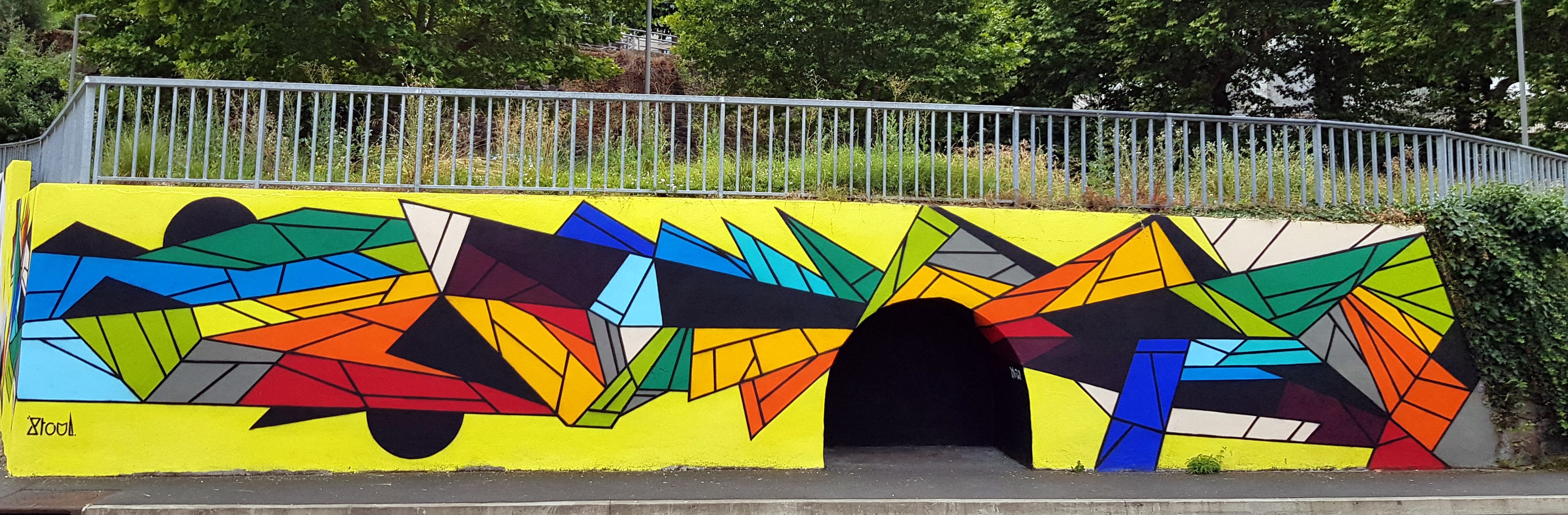 L’oeuvre est de type graffiti. Vous pouvez l’admirer dans la ville de Decazeville en France et plus précisément ici : 18 Site Indus.du Centre Ville, 12300 Decazeville, France.