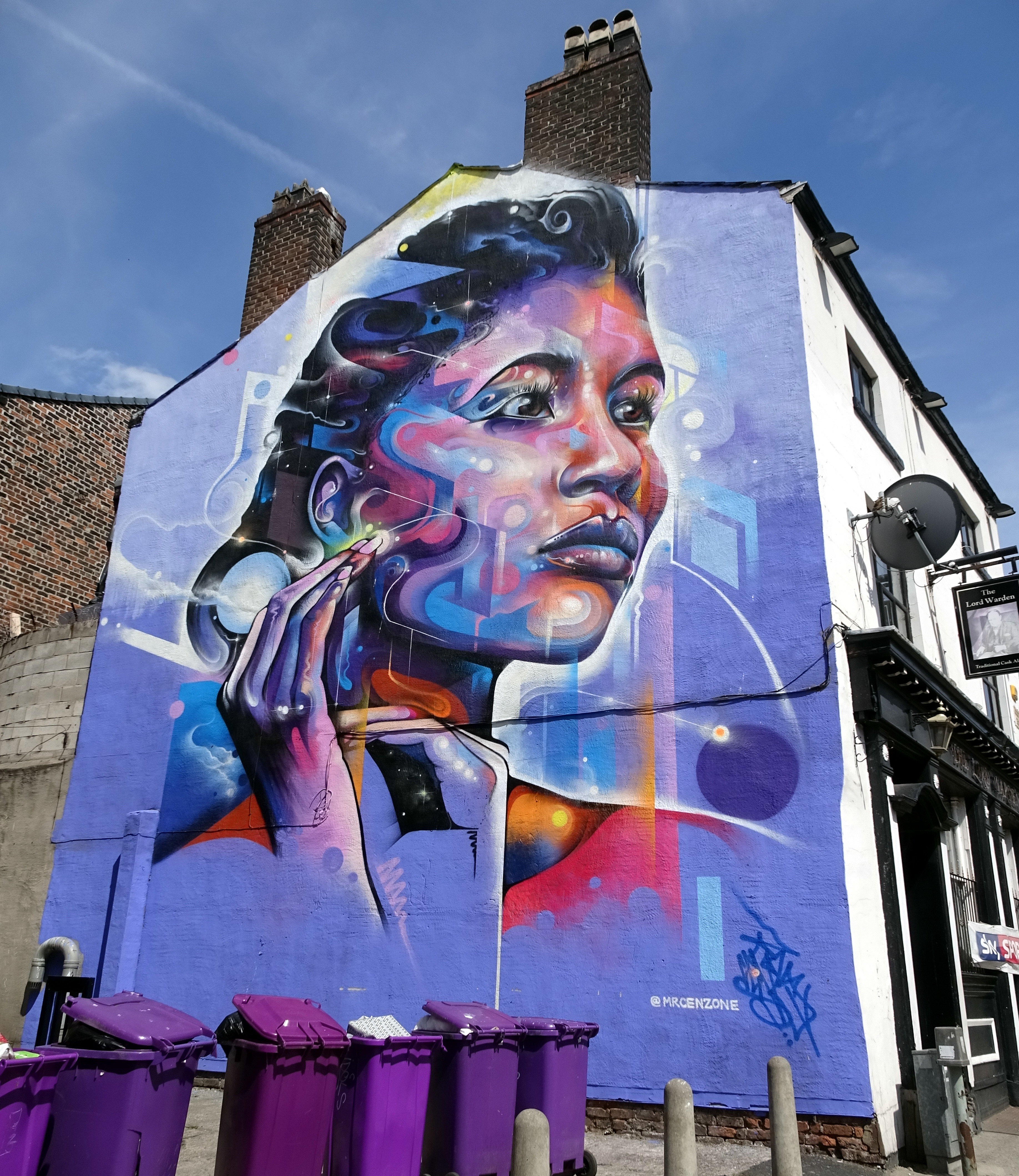 L’oeuvre est de type graffiti. Vous pouvez l’admirer dans la ville de liverpool en United Kingdom et plus précisément ici : 12 London Rd, Liverpool L3 5NF, UK.