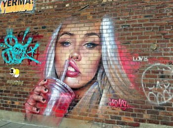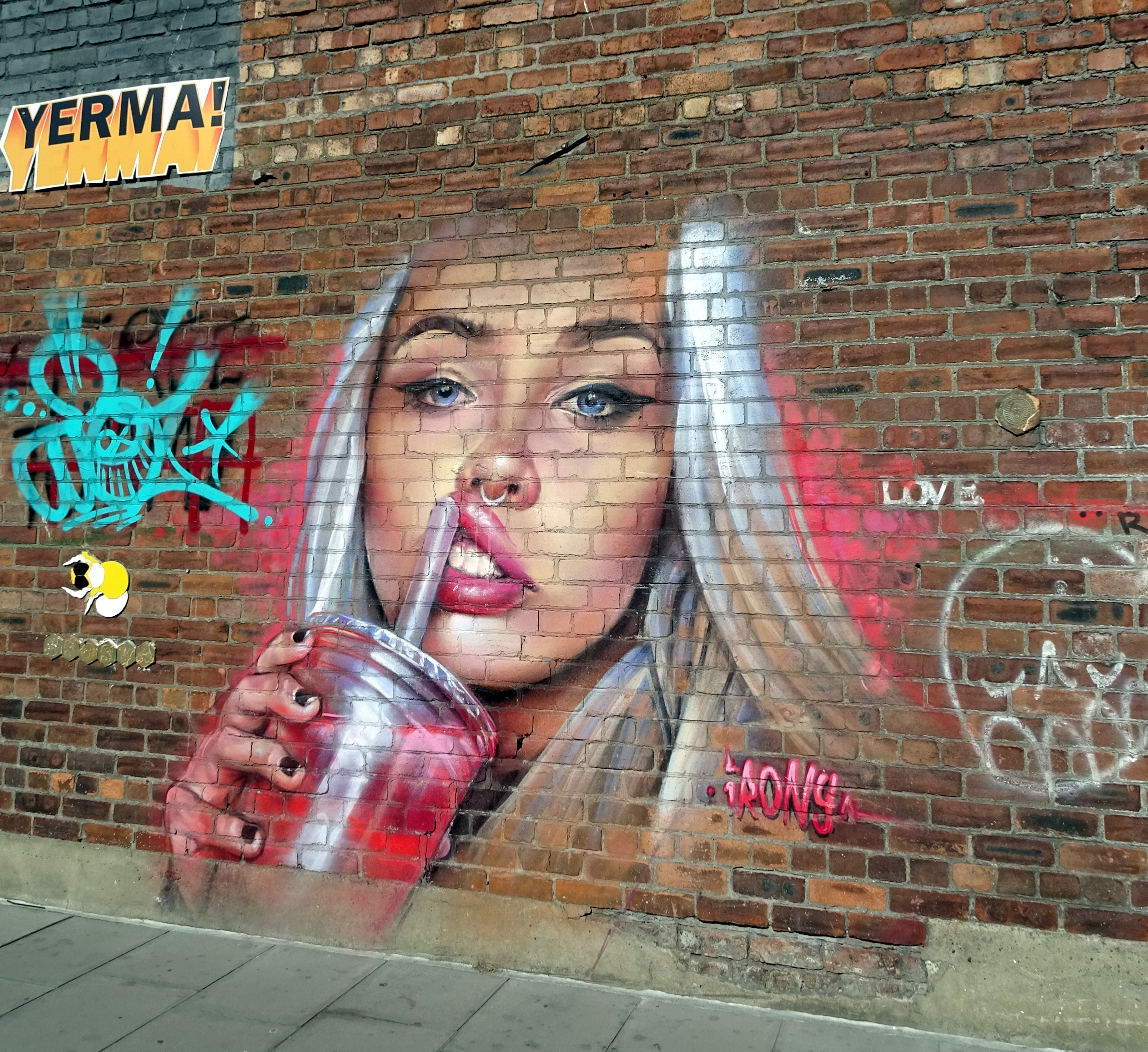 L’oeuvre est de type graffiti. Vous pouvez l’admirer dans la ville de liverpool en United Kingdom et plus précisément ici : 42 Jamaica St, Liverpool L1 0AH, UK.