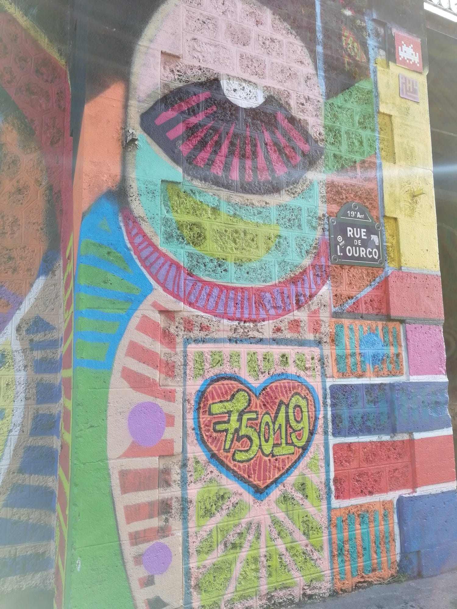 L’oeuvre est de type graffiti. Vous pouvez l’admirer dans la ville de Paris en France et plus précisément ici : 2 Rue de l'Ourcq, 75019 Paris, France.