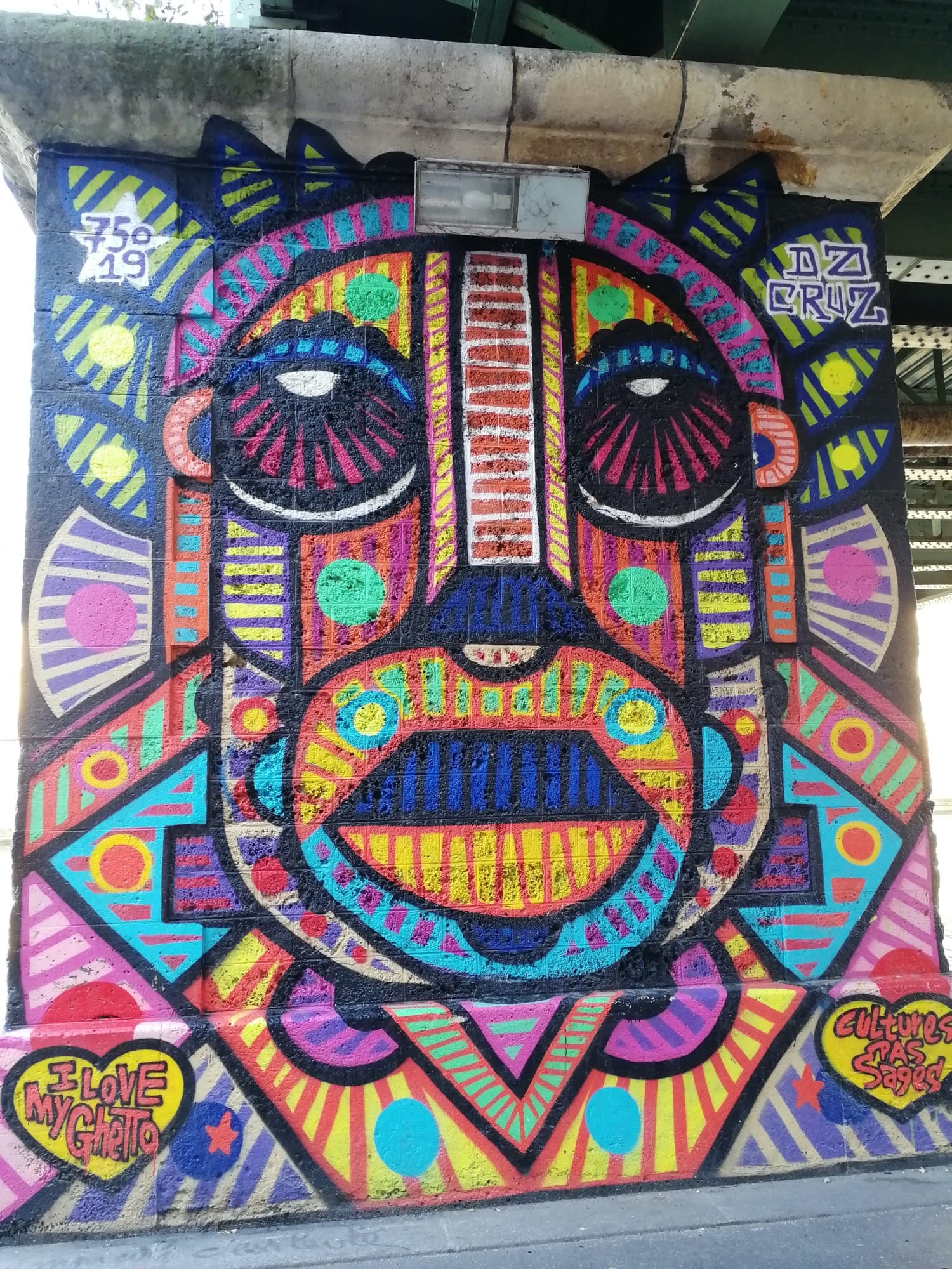 L’oeuvre est de type graffiti. Vous pouvez l’admirer dans la ville de Paris en France et plus précisément ici : 9 Quai de l'Oise, 75019 Paris, France.