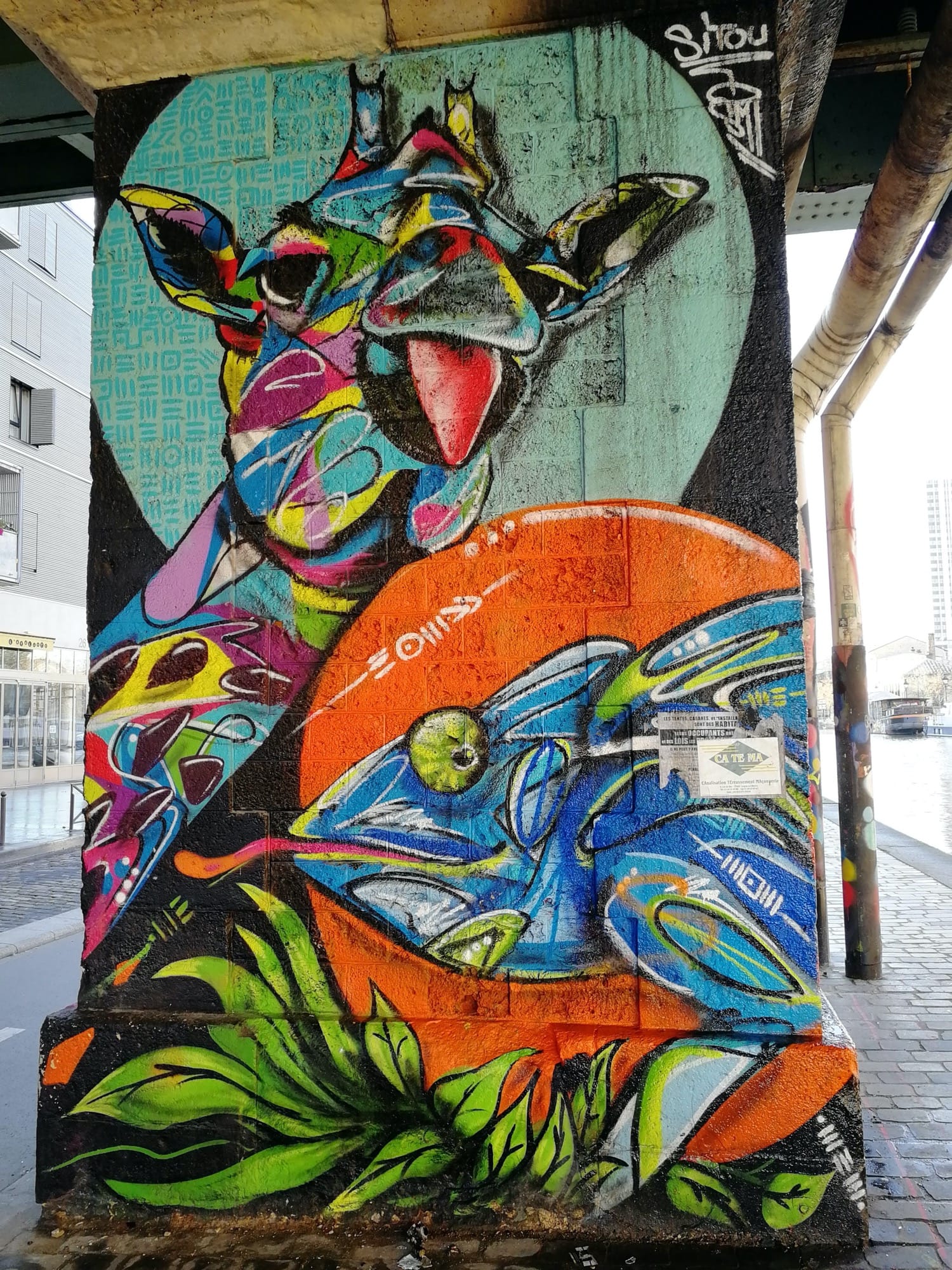 L’oeuvre est de type graffiti. Vous pouvez l’admirer dans la ville de Paris en France et plus précisément ici : Passerelle des Ardennes, 24a Rue de l'Ourcq, 75019 Paris, France.