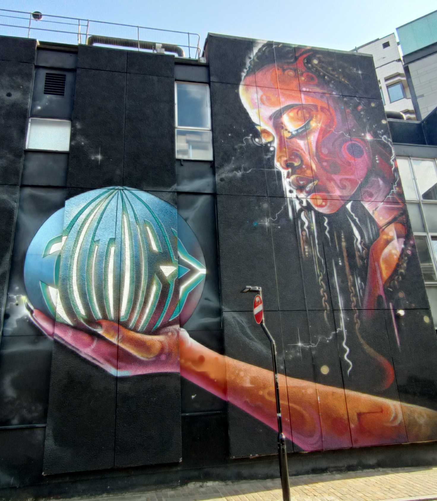 L’oeuvre est de type graffiti. Vous pouvez l’admirer dans la ville de England en United Kingdom et plus précisément ici : The Theatre Courtyard, 1 New Inn Yard, London EC2A 3EE, UK.