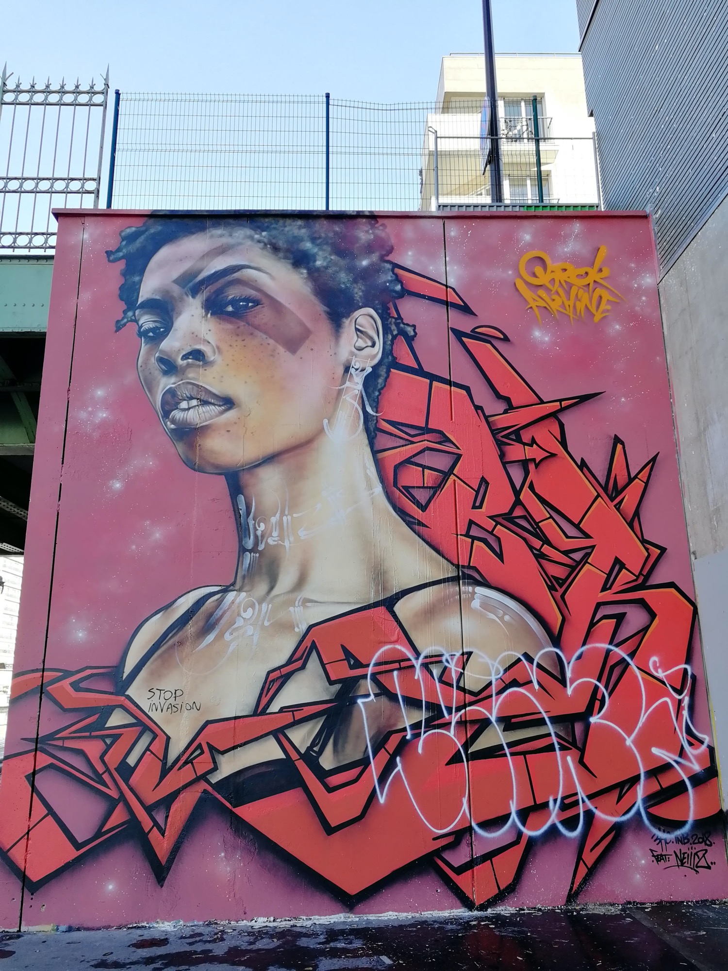 L’oeuvre est de type graffiti. Vous pouvez l’admirer dans la ville de Paris en France et plus précisément ici : Passerelle des Ardennes, 24a Rue de l'Ourcq, 75019 Paris, France.