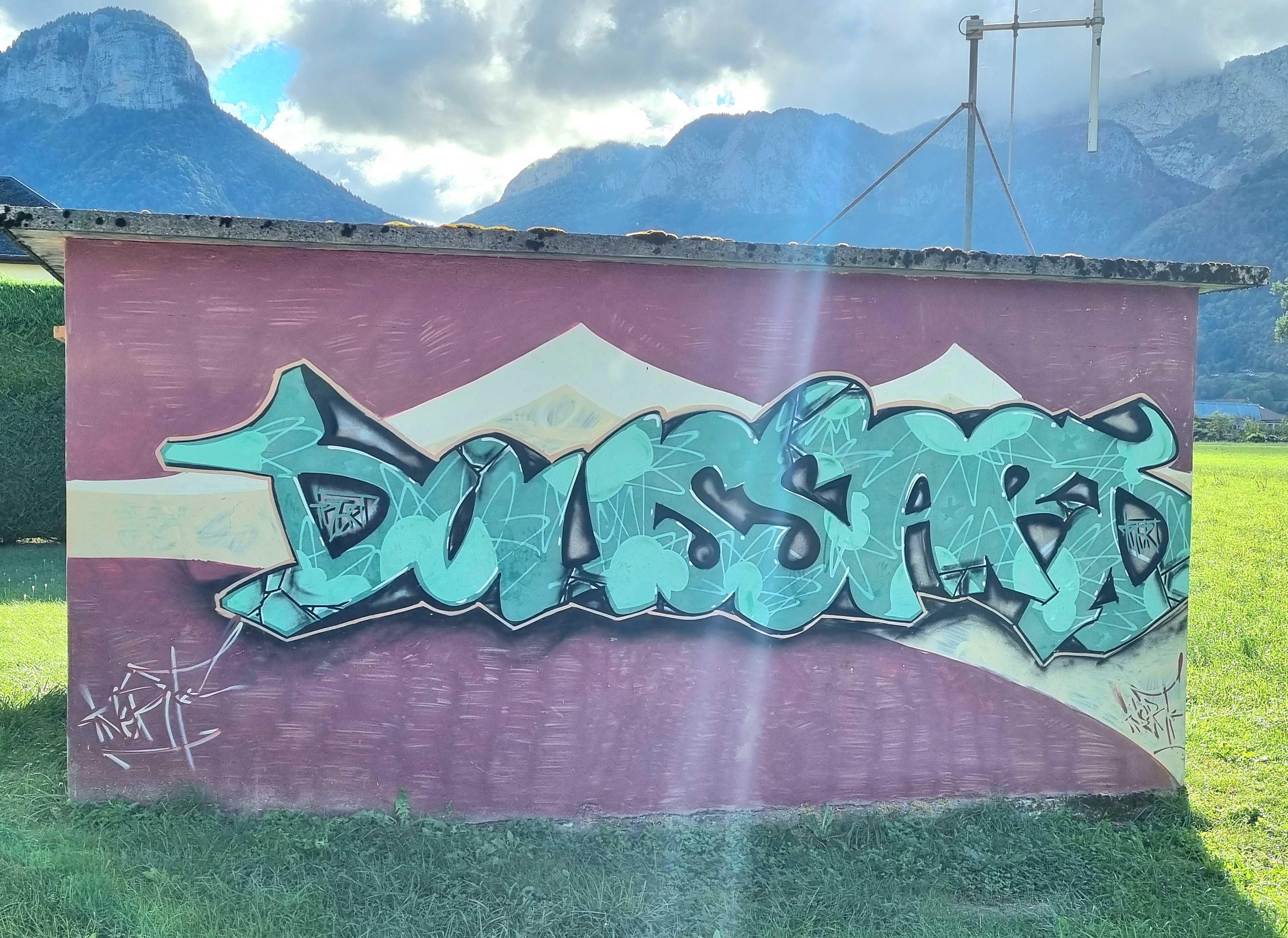 L’oeuvre est de type graffiti. Vous pouvez l’admirer dans la ville de Doussard en France et plus précisément ici : 583 Rte de la Gare, 74210 Doussard, France.