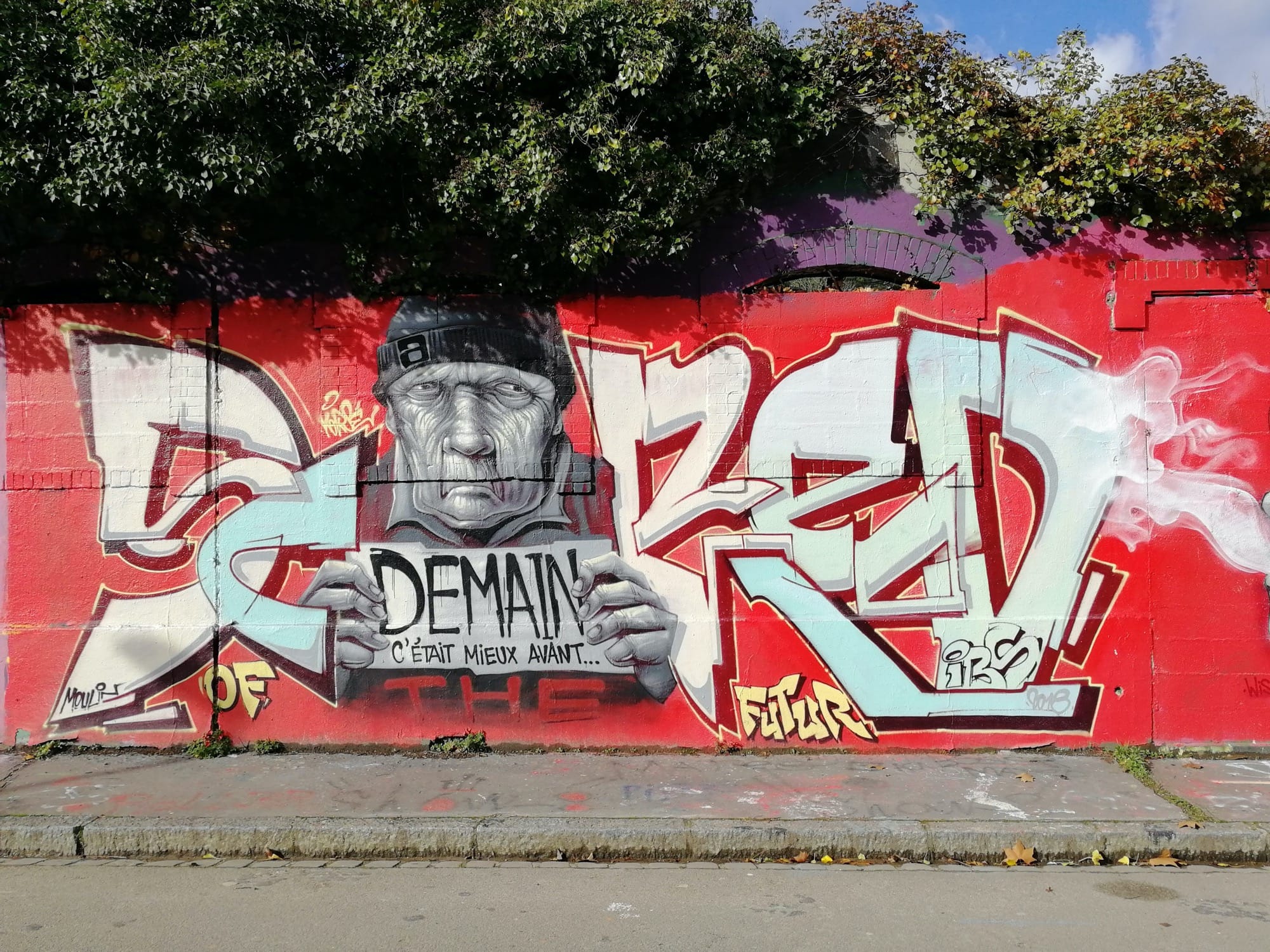 L’oeuvre est de type graffiti. Vous pouvez l’admirer dans la ville de Nantes en France et plus précisément ici : 3 Boulevard de Cardiff, 44100 Nantes, France.