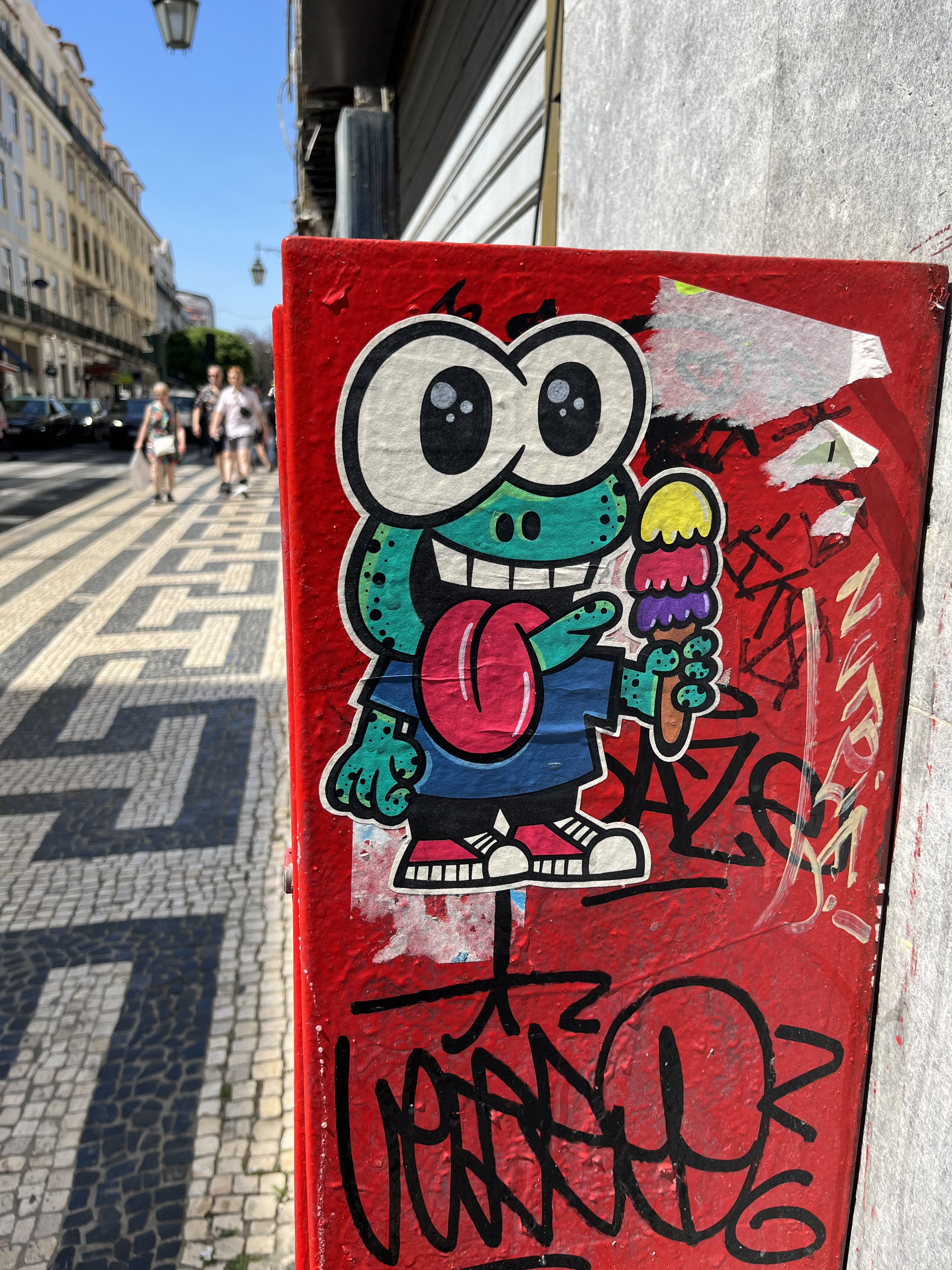 L’oeuvre est de type sticking. Vous pouvez l’admirer dans la ville de Lisboa en Portugal et plus précisément ici : R. do Comércio 241, 1100-062 Lisboa, Portugal.
