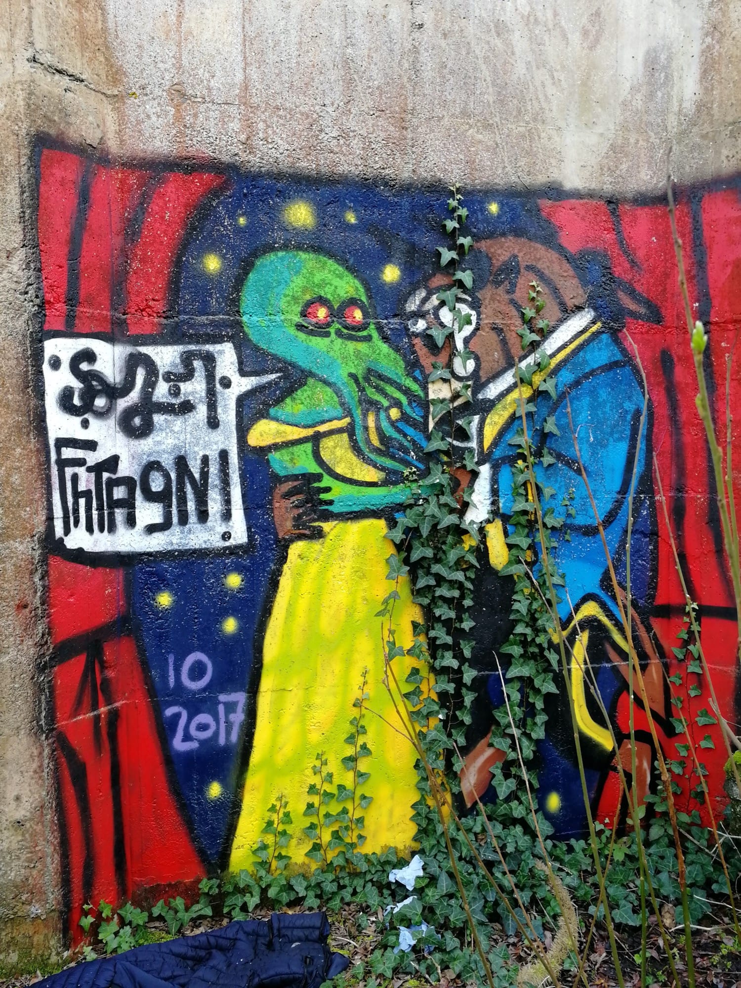 L’oeuvre est de type graffiti. Vous pouvez l’admirer dans la ville de Trignac en France et plus précisément ici : 9 Rue de la Gare, 44570 Trignac, France.