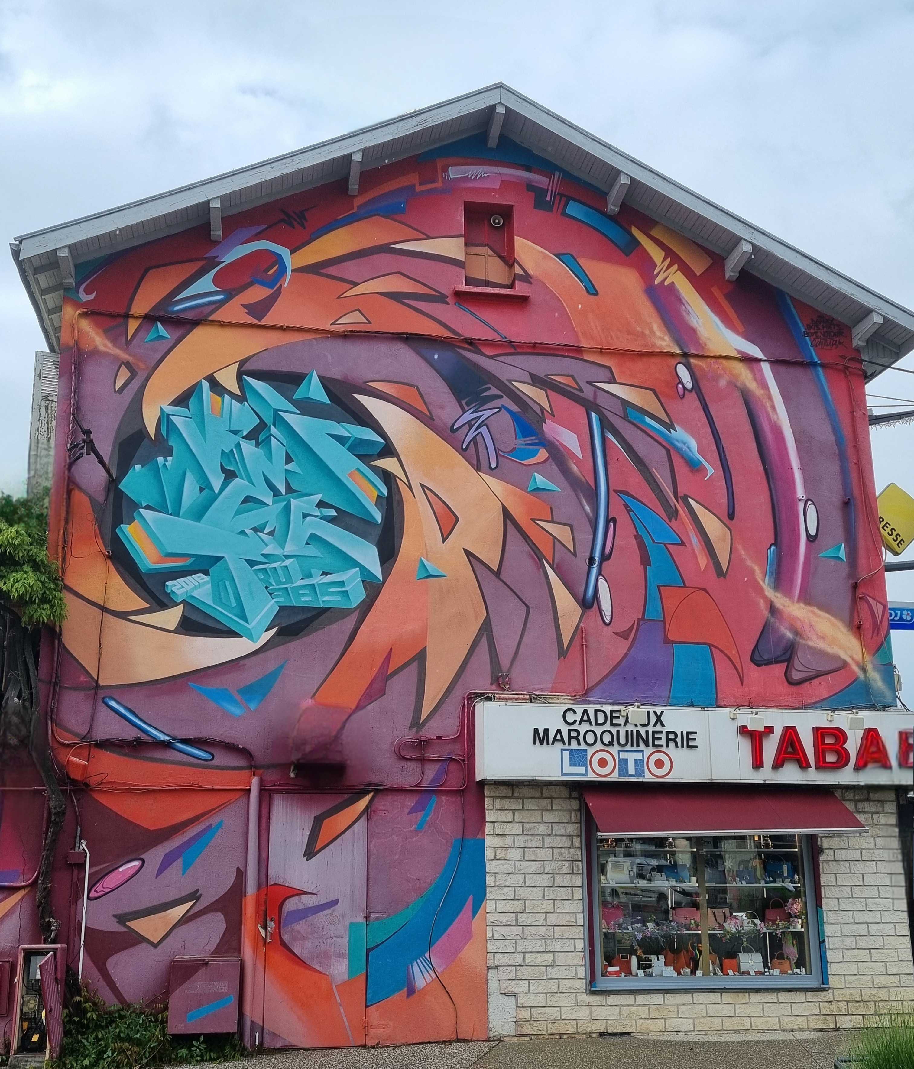L’oeuvre est de type graffiti. Vous pouvez l’admirer dans la ville de Le Pont-de-Claix en France et plus précisément ici : 1 Av. du General Juin, 38800 Le Pont-de-Claix, France.