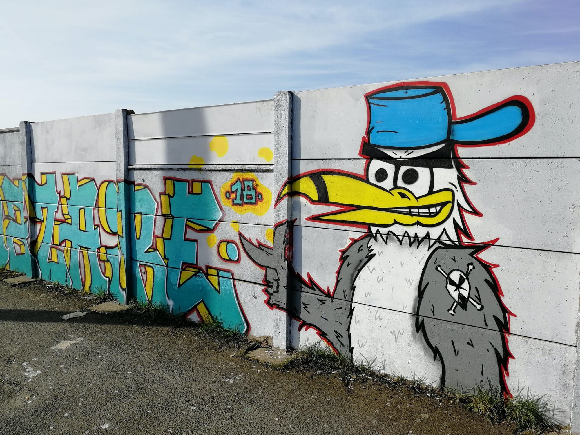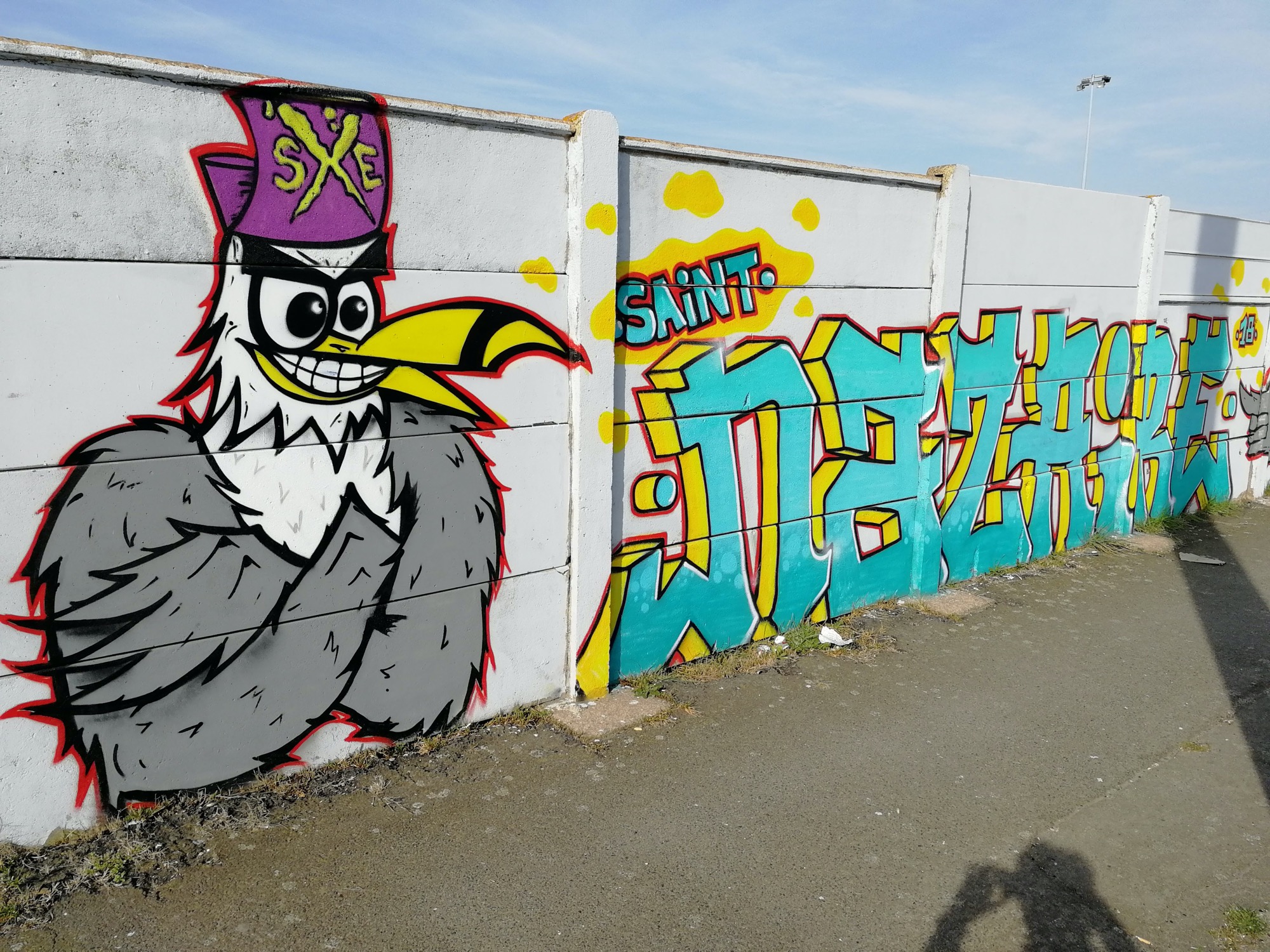 L’oeuvre est de type graffiti. Vous pouvez l’admirer dans la ville de Saint-Nazaire en France et plus précisément ici : 1 Rue de la ville Halluard, 44600 Saint-Nazaire, France.
